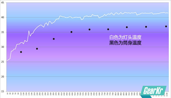 P60前七分钟温度一直几乎均匀上升了15℃,此后一直在40℃和41℃左右徘徊,这与亮度大幅下降后发热下降也有关系。筒身最高温度在38.2℃,握感十分舒适,不会烫手。