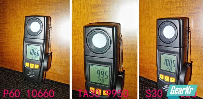 使用同样的电池、同样的1米左右距离,P60得益于深光杯更聚光一些,照度稍高于S30和TA30,三者的光通量应该是差不多的。