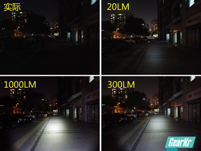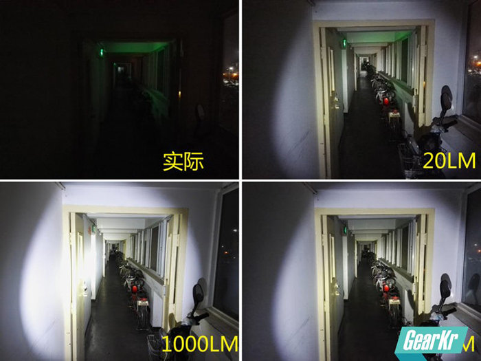 楼道进深约30米+,20LM状态能够看清楚近处的门框和一溜自行车;中亮300LM可以看清整体情况,30米尽头的墙面窗户也能看清;高亮1000LM则把整个楼道完全照亮。正常使用300LM中亮足以。