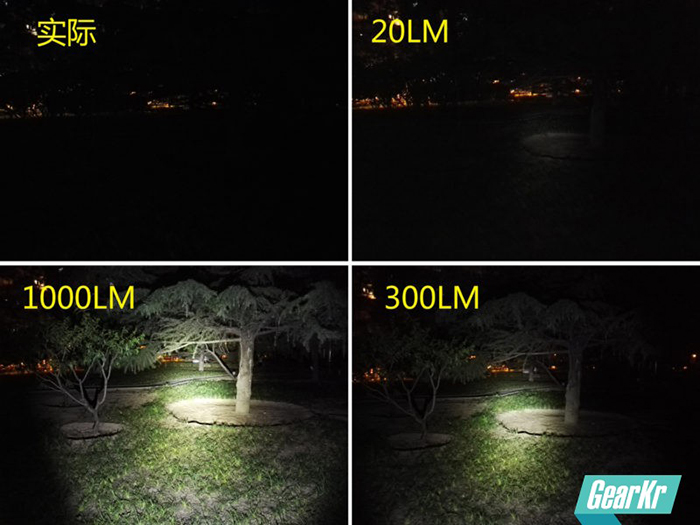 手电的使用多是在户外,由于环境空间大,光线会被发散和吸收,所以无论多亮都会感觉比室内要暗一些,特别是泛光的部分光线会显得更弱。实际环境除了远处的几盏灯光什么都拍不出来,低亮对面前5米的树坑能够展现出来;中亮300LM把近处约10米内的环境整体能够显示出来;最亮状态的穿透力还是不错,能够看出来后面的若干棵树、以及更后方的草坪,整体环境也更亮一些。