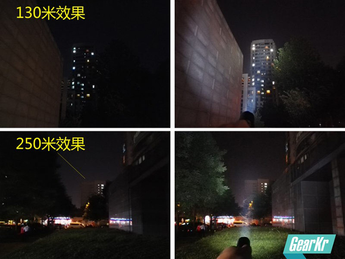 选取两处场景,第一个大约130米左右的大楼,从效果来看,楼体从上到下都能够被手电光线所覆盖,近处侧面的墙体和树木也被照亮了;250米效果不如之前的明显,但也能看出来楼角已经被照亮。