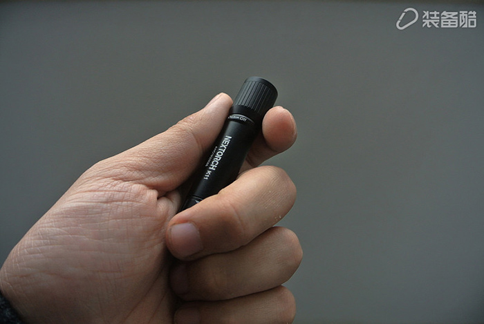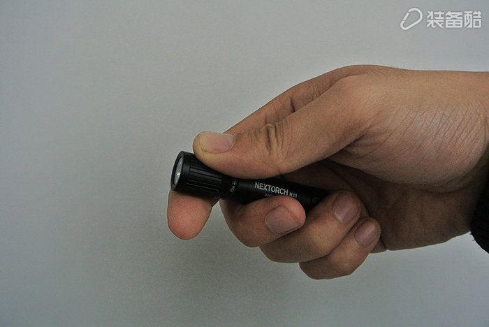 纳丽德K11迷你随身手电分为前中后三个区域,头部和尾部加入了简单的条纹处理保证手感,中间身子则纯直筒设计,尤为简单。正面印有品牌产品的白色logo:NEXTORCH K11以及一串类似于专利号的字母数字组合,“ON-OFF”的旋转开关指示也位于头部以下,方便操作时的提示。