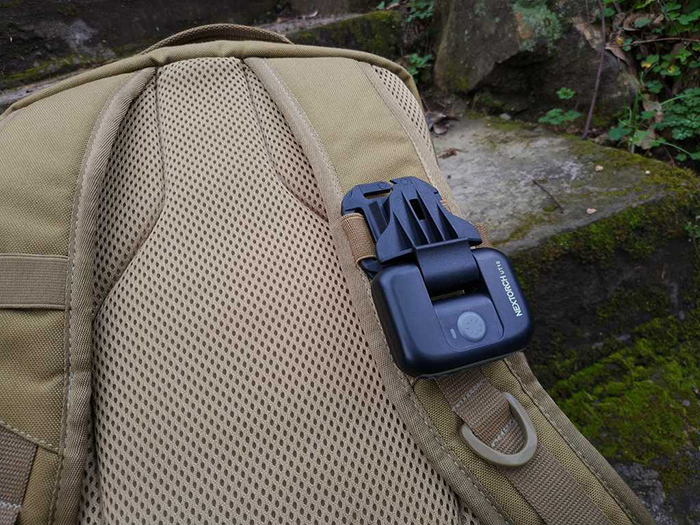 因为多功能抱夹开口位置具有弹性收口的效果,所以将之别在背包上就具有非常稳定的效果。如此在剧烈获知快速的活动中也能稳固而不至于丢失。