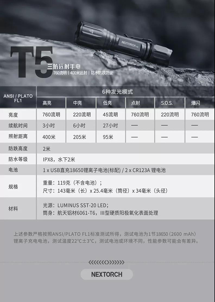 根据官方资料,T5采用了LUMINUS LED,高亮760流明时,最远射程到达400米,远高于TA30高亮1100流明时的240米。