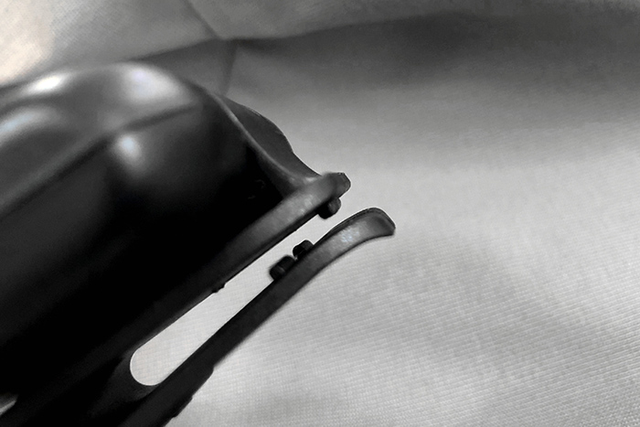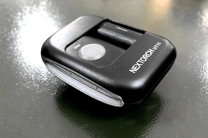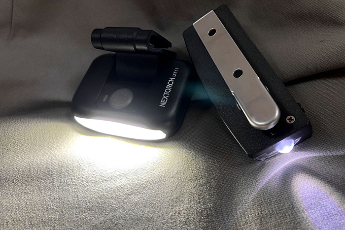 不过这种帽夹有一个缺点,就是固定在肩章上作为肩灯使用时,无法调节角度,想要进行照明的时候不太方便。但这个缺点在UT11上体现的并不明显,大家都能感觉到UT11的外观是比较薄的,附挂在帽子上、肩章上不会显得太突兀。利用它的这个优点,我们可以尝试一种新的挂法——将其在肩章上反挂,这样既可以稳固附挂,防止其在剧烈运动时掉落,也可以让肩灯的照明角度变得可以调节。