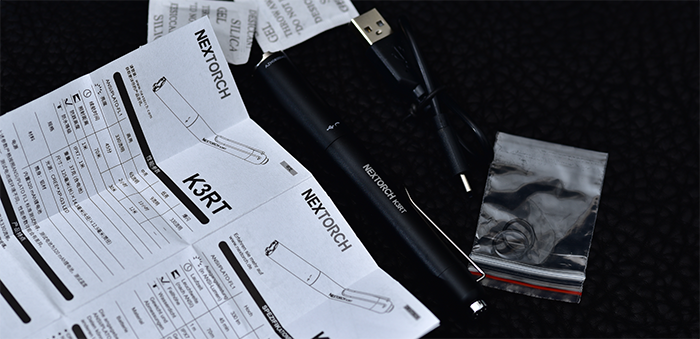 打开包装后可以看到透明塑料托盘里的手电主体和Type-C的充电线、备用O圈、两包干燥剂还有一本说明书,必须好评Type-C的充电接口,很是符合当下电子充电设备的通用性。