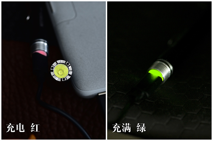 在筒身印有产品LOGO和型号,在筒头的顶部印有产品编号,筒身接口处标有充电接口位置。