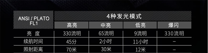 K3RT手电共四种照明模式,亮度参考下图。最高的330流明搭配中低档足够我日常使用,由于是内置320 mAh锂电池,最高流明的续航时间是40分钟左右,但对于不用户外出行来说足矣,基本一周一充。