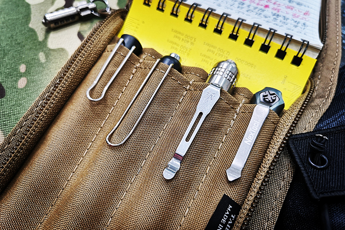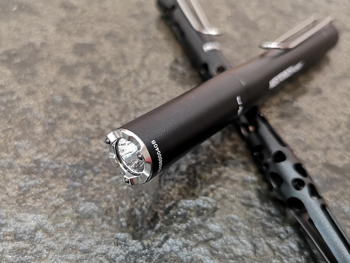 与此前多款K3系列手电一样,如同LAMY钢笔如出一辙的钢丝型不锈钢背夹位于电池仓后部,虽然夹持力度不如常见的钢片型背夹大,但也不至于松垮得夹不住布料。经实测,不仅能紧紧夹在诸如皮革之类较厚材质的包袋上,就是轻薄顺滑的内层织物上也完全Hold得住。