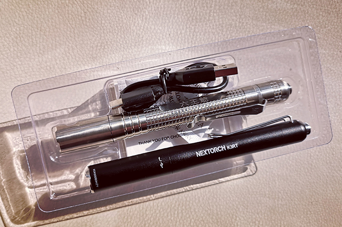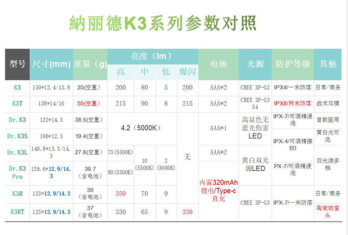 以上便是某度百科对笔形手电这种电筒类型的描述,而网页上的词条配图,正是一支来自納丽德的K3商务手电。作为同类产品中非常具有代表性的一款,K3一直不断推出各种版本的后续型号,从双模战术的K3T,再到一系列采用高显色无蓝光伤害的医用系列笔形手电:Dr.K3\Dr.K3L\K3S\Dr.K3pro。又在今年初推出了两款内置锂电,采用Type C直充的笔形手电K3R和K3RT。前者可以视为K3这款初代的直充加强升级版,而这篇文章的主角K3RT,则加上了納丽德著名的纳米陶瓷破窗/攻击头,可以说是集日常EDC、户外使用和应急防卫于一身的产品,且具备Type C直充功能的同系列顶配。