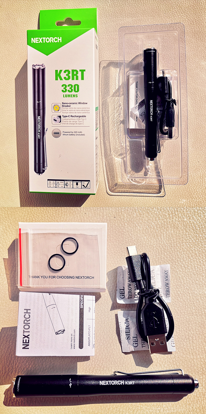 内包装沿用了K3T或者K3的透明吸塑盒向下兼容(K3T直径最粗,K3长度最长),内含K3RT手电一支、Type C充电线一条、祖传白纸包一个(里面是说明书和备用O圈)以及两包防潮剂,熟悉的配方,熟悉的味道~