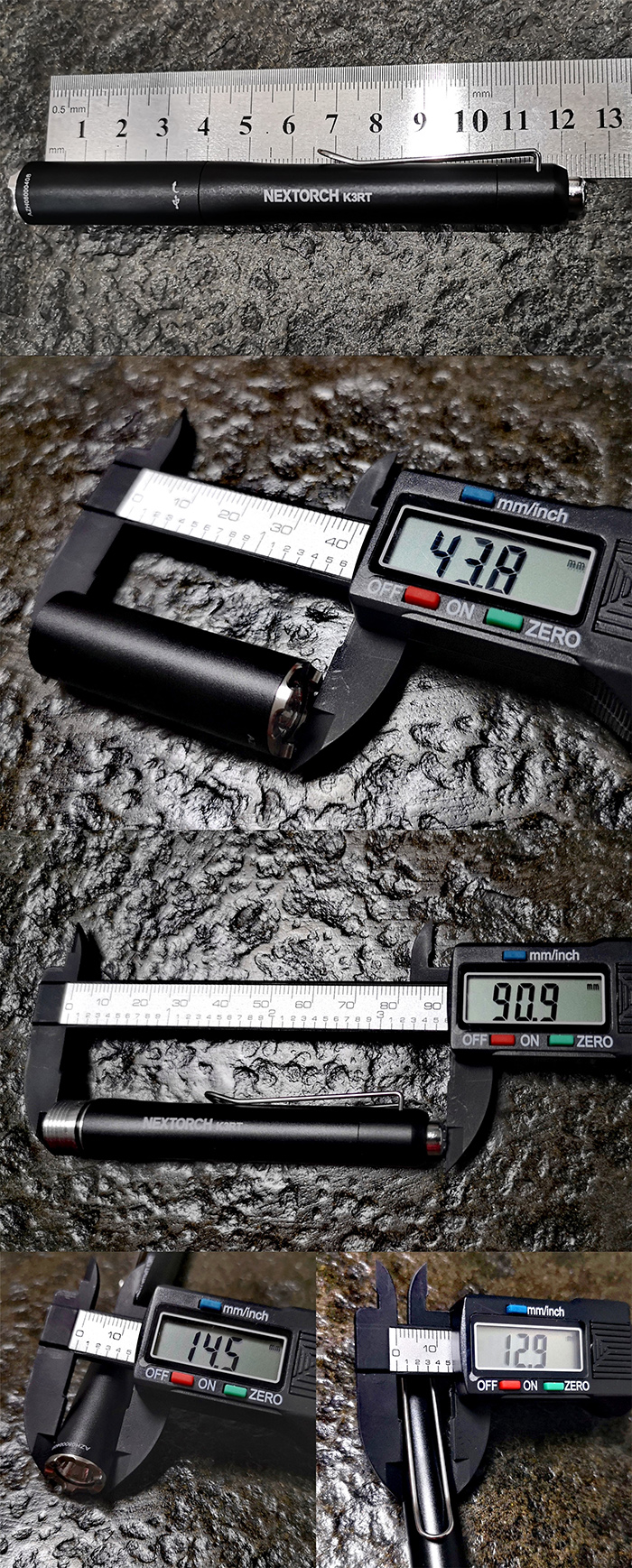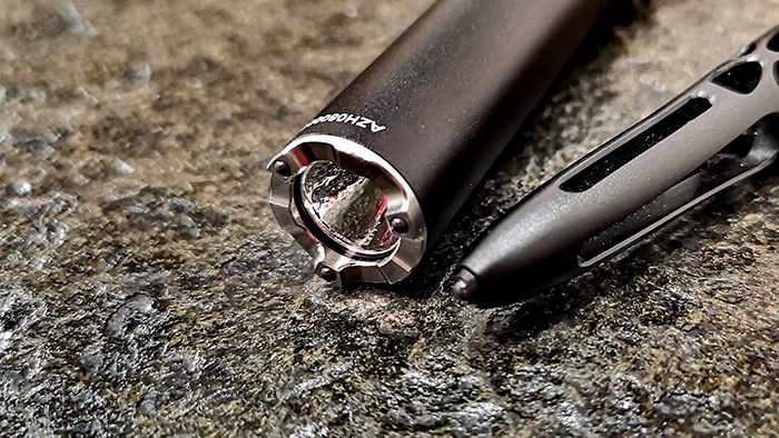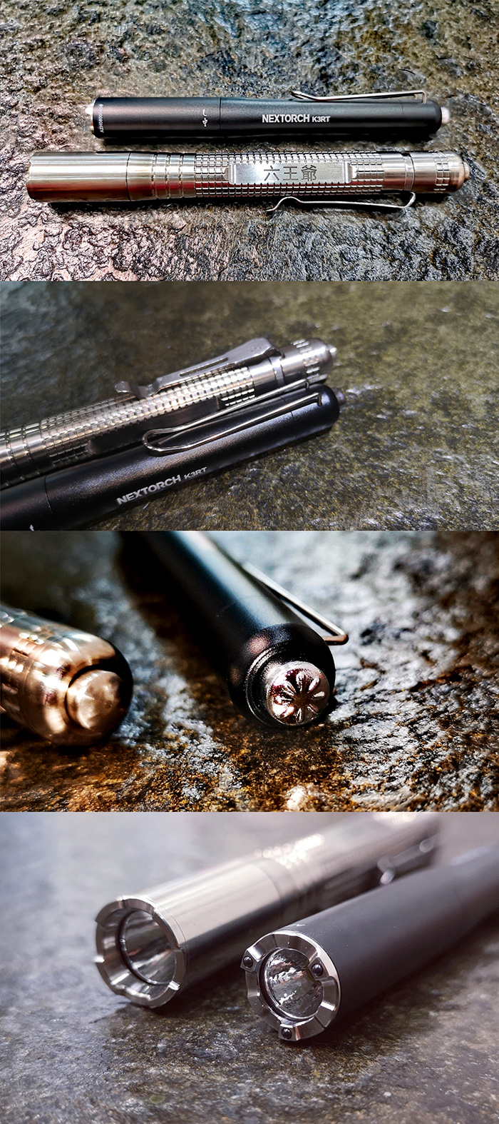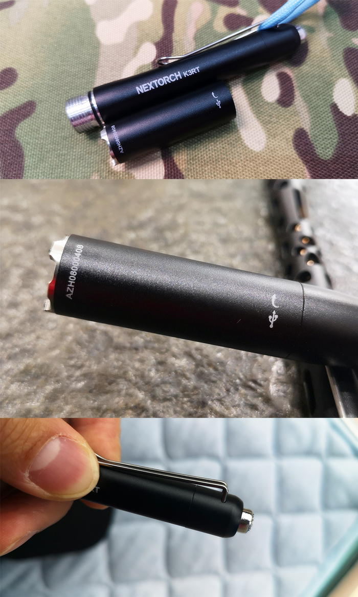 尾部顶上的镀铬硬塑尾按开关表面为納丽德标志性的八条筋设计,这个被戏称为“菊花键”的尾部开关是之前产品的沿用件。根据文章开头整理的K3系列参数比对,我个人不负责地猜测,K3RT和K3R 可能直接使用了納丽德首款Type C直充笔形手电Dr.K3 Pro那根直径12.9mm的电池仓(筒身部分),并在前部套用不同设计偏向、直径14.3的的筒头部分,功能细分为医用、日常/商务和自卫/应急。