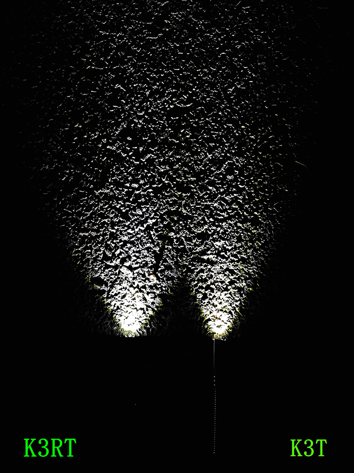 发光单元使用一枚技术成熟的CREE G3 LED,搭配橘皮反光杯,与前辈K3T一样是正白色光,虽然出光口径略小但灯杯深度也浅,相对来说反光杯角度却更大,出光角也更大。不过光斑方面也受限于窄小的灯杯,近距离照光会有严重的中心耀光,330流明的高亮档着实不建议近距离照射,同时呈现三层色温和亮度各不相同的区域,中低档位尤其明显,过渡也很硬。