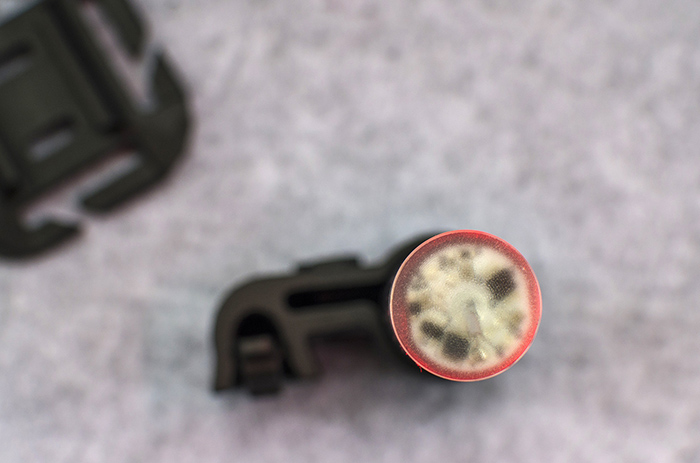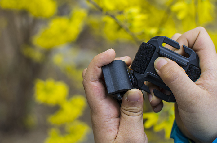二是通过背板的挂钩,固定在MOLLE系统织带,以及裤子的腰带环、帽子后部调节带等其他带状物之上。GKT在标准1英寸MOLLE织带上非常稳定,不会晃动,但是对于一些较厚的织带,套上简单,取下时得用巧劲。