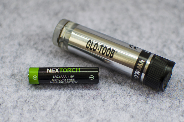GT-AAA Aurora使用方便易得的AAA电池作为电源,纳丽德标配了一只电池,镍氢充电电池也能正常使用。经实测,GT-AAA全长77.7mm,直径为19mm,与7号即AAA电池相比,身材虽然整体大了一号,但仍属于小巧便携的类型。