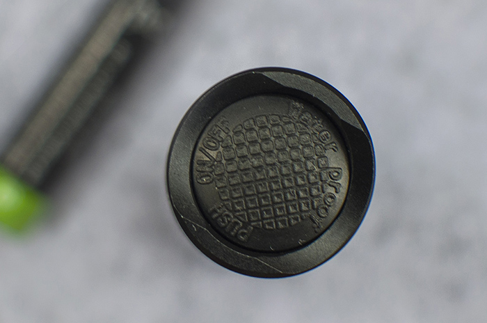 胶帽表面有防滑颗粒,侧面有指压弧形槽,开关键程适中,内部弹簧力度不算硬,按动有清晰的声音和触觉反馈。