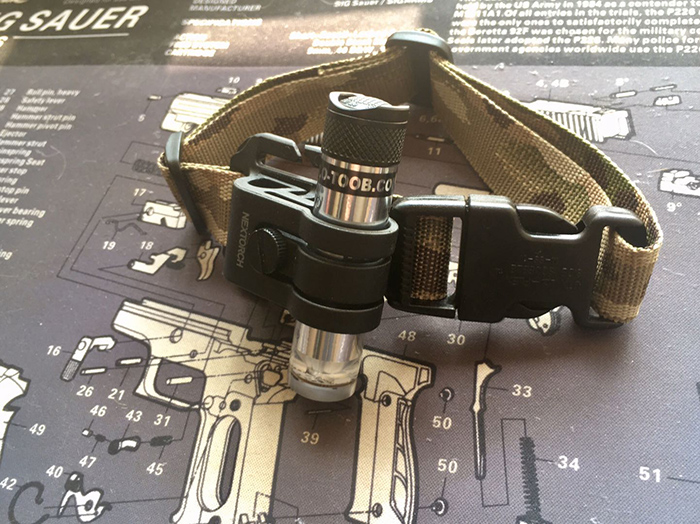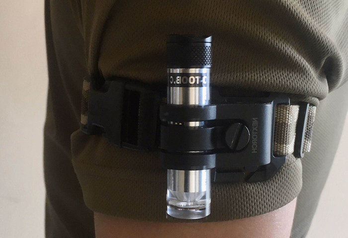 另外在运动时,例如夜跑和潜水这种需要信号灯的标明位置的低可视度场景,我的使用习惯是把灯绑在一侧胳膊上,以求让尽可能多的方向来车/人可以看到我,GTK系统里的双面魔术贴长度是为了固定在头盔上设计的,对直接佩戴在肢体上来说就显得不够长了,需要我自己额外DIY一条。