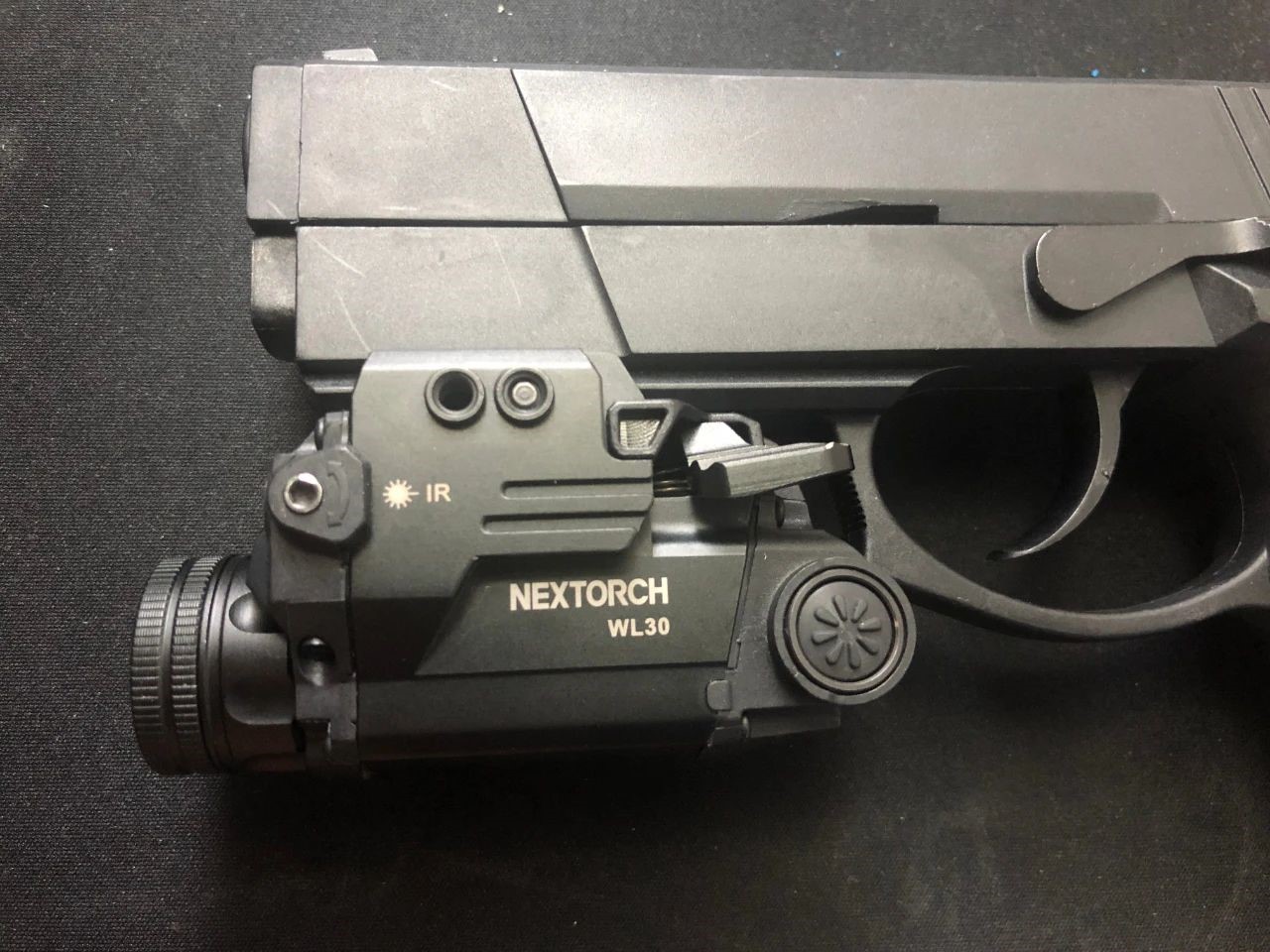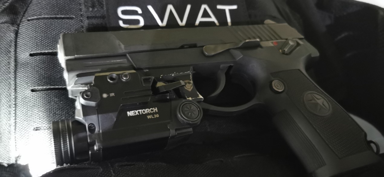 我们这就看看WL30的真面目。它采用的是标准皮卡汀尼导轨版,原样机有92版,但是,众所周知,目前具备皮卡汀尼导轨的92G手枪已取代原92,成为警察手中的新武器,所以用用92G安装WL30稳稳的没问题。