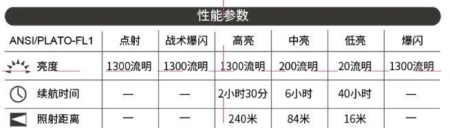 (4)3档进入1300流明持续照明,户外徒步非常适用,照射距离可达240米。