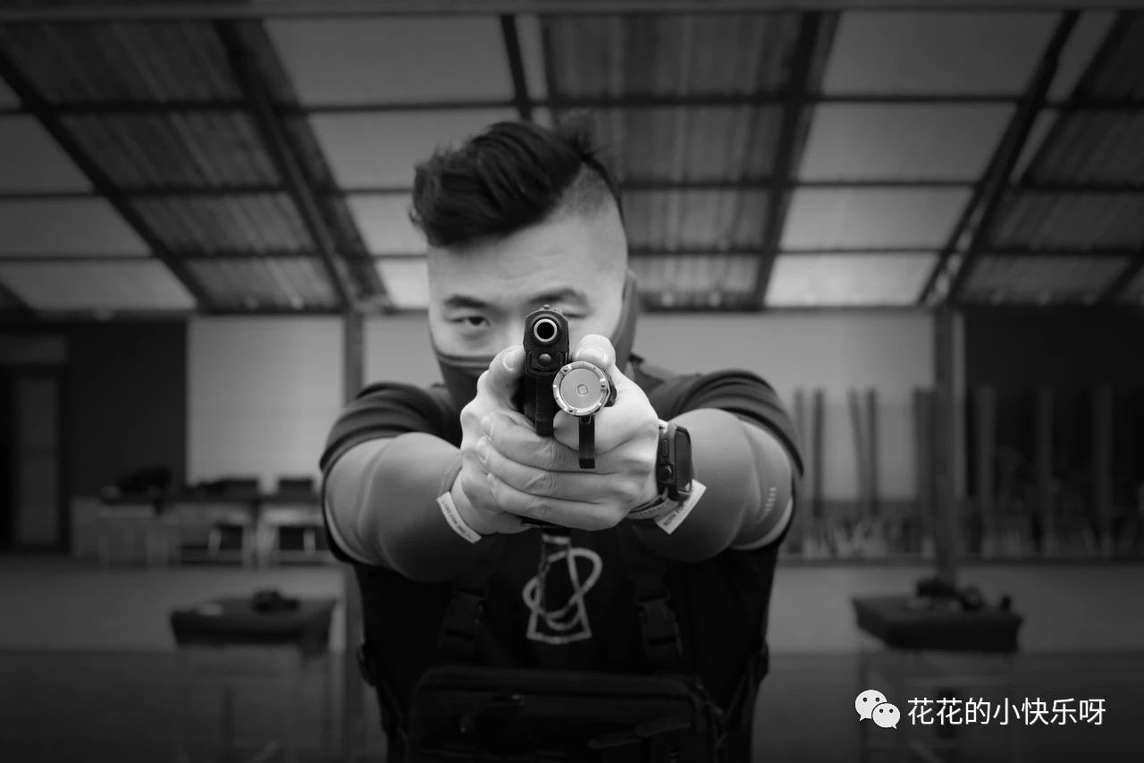 二是将弱手食指插入闭孔环,其余三指包裹持枪手三指。
