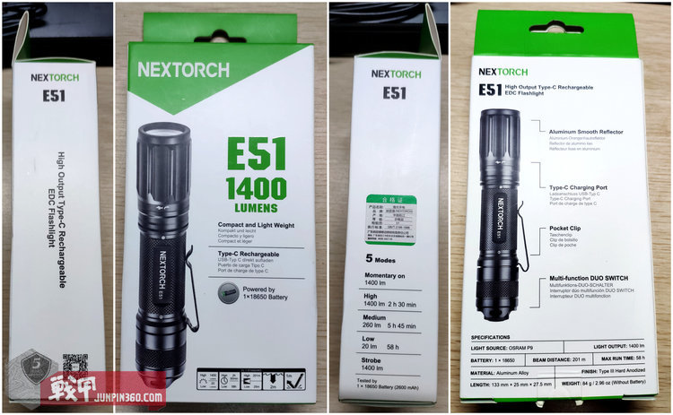 先看包装,外包装还是一如既往的纳丽德家族风格。白色底点缀绿色色块。由于纳丽德以出口为主,为了国际通用性,外包装是整体英文的。主要参数与功能都有在外包装上体现出了。而且用的都是图形化符号表示,即使不懂英文也可以猜测出来含义。可以看到光源光通量最大为1400流明,最低为20流明;高亮度续航2小时30分钟,最低亮度续航58小时;高亮度照明距离201米,最低亮度照明距离25米;防水2米,防跌落1米;充电接口升级为了TYPE-C,随包装带一节2600mAh的18650电池。