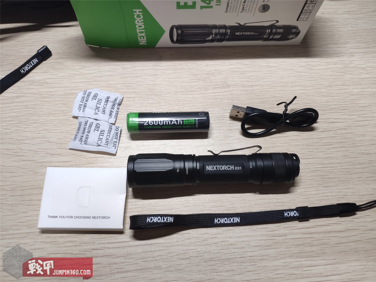 打开包装,这些就是全部了。手电本体、一个手绳、一节2600mAh电池、一根TYPE-C短线、说明书与配件包、两包硅胶干燥剂。