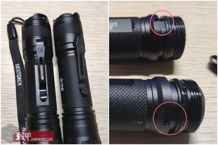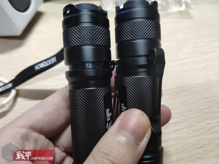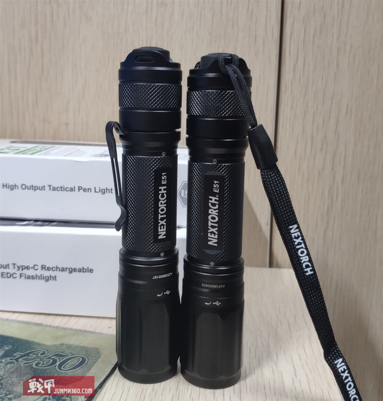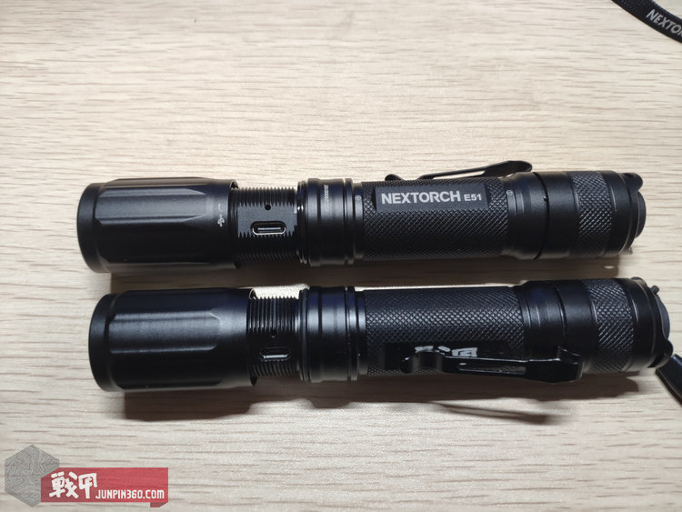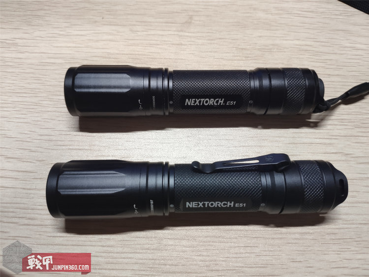 接下来说说手电本体,和以前的E51-17款放在一起对比。不做说明的情况下猜猜哪个是17款,哪个是19款?不买卖关子了,上面绑了手绳的是17款,没手绳的是19款。以下都按这个区分。