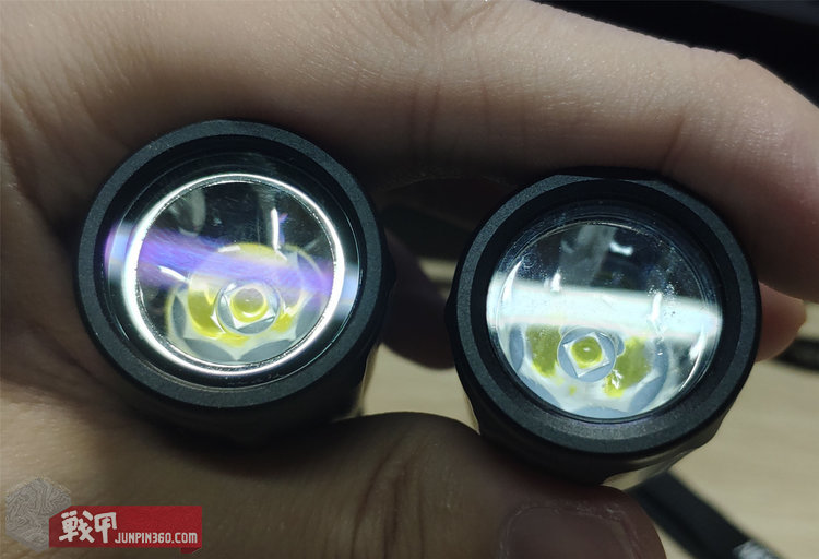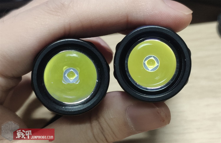 直视光杯是一个比较直观判断光杯设计的方法。两款手电的反射效果都比较好。光杯内LED的黄色被较为均匀的反射。看起来新款光杯按照新光源进行了匹配优化,没有为了省成本直接拿来旧款的用。