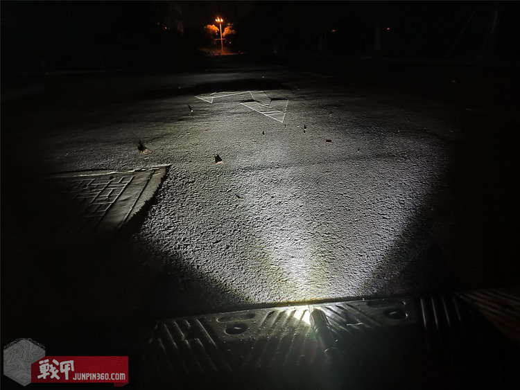 还是平放手电筒,但适当降低亮度,观察光照区域。中间聚光区域相对平行,散射不大可保证远射效果。而周围的泛光区亮度也不是很低,高亮度的核心与小尺寸较短较小的光杯保证了聚光的同时,聚不起来的反光区域也不至于太暗淡。