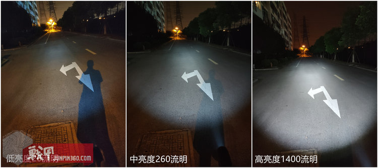 三种亮度档中近距离照明效果。如果用作行道照明,中亮度足以满足正常需求。高亮下聚光可以覆盖一个车道的宽度,而算上范光足以让使用者看清单向两车道在加上个人行道。