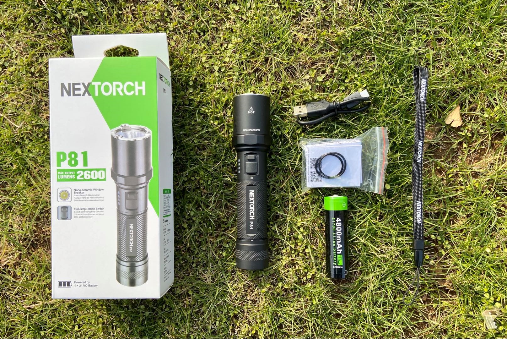 接下来我们打开包装盒,将内部物品取出,包装盒内的全部配件如下:P81手电x1,21700电池x1,USB-C充电线x1,手绳x 1,备用密封圈x2,说明书x 1。