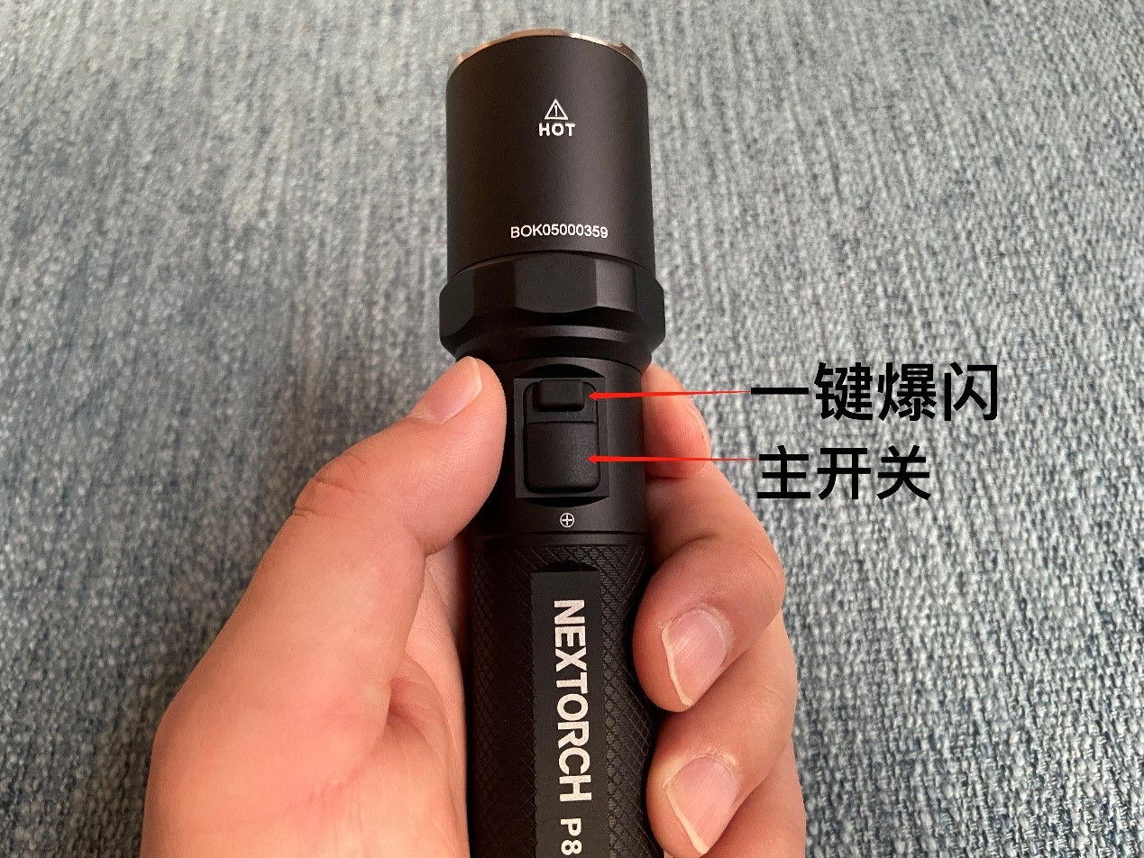侧按双开关,新国标军警手电,一键爆闪 独立按键。