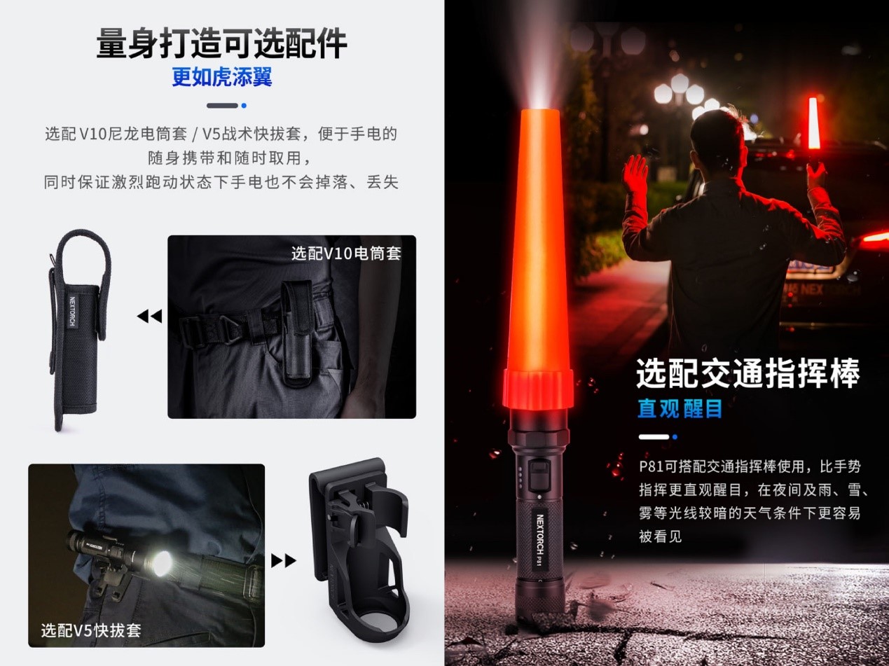 说到倒立使用肯定少不了指挥棒,纳丽德为P81量身打造多个可选配件,如V10尼龙电筒套,V5战术快把套,便于手电随身携带和随时取用,同时保证激烈跑动状态下手电不会掉落,丢失。还有选配交通指挥棒,P81可搭配交通指挥棒使用,比手势指挥更加醒目,在夜间及雨,雪,雾等光线比较暗的天气条件下更容易被看见。