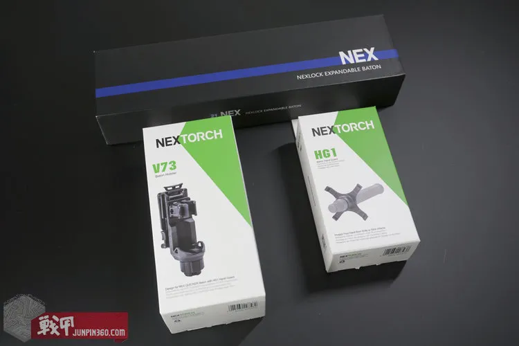 NEX快客勤务系列的机械棍都是采用长方形的纸盒包装,配色以黑色为主加以一条蓝色的条纹进行点缀。而配件类产品则是采用了与照明类产品相同的白绿配色。