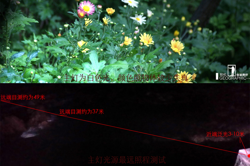 主灯最高亮度远端照明范围和近端照明范围照度对比; 主灯照明色感和主灯高亮140流明的照程距离测试;
