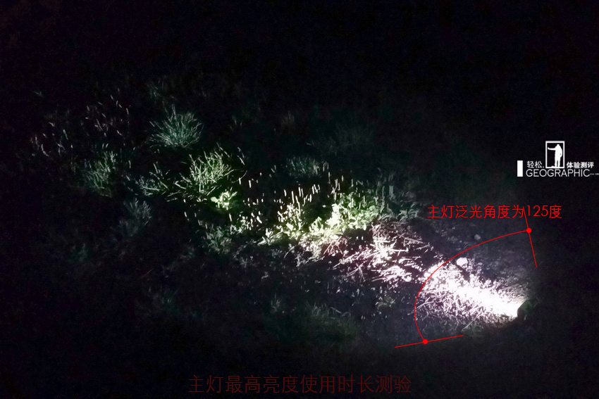 头灯最高亮度使用时长测验;头灯泛光角度示意;