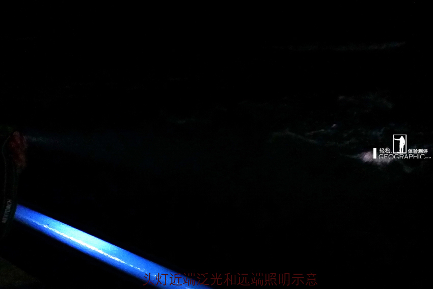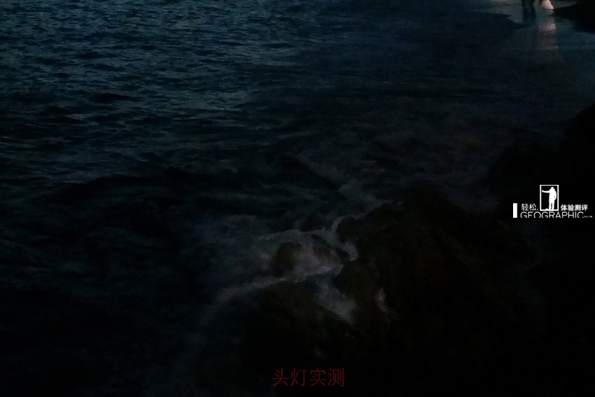 3照明距离测试:使用主灯高亮模式照亮海面,远处浪花和礁石反光,天气状况为一般,时间为晚10点;目测约计50米,标注称60米,测试略低,但实验室环境应该可以达到,标注基本属实;
