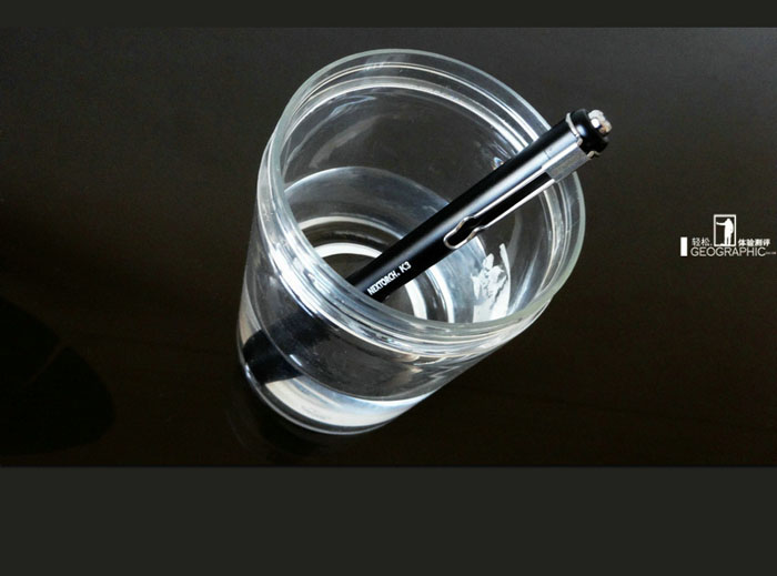 纳丽德NEXTORCH钛黑色K3笔形电筒的防水能力测试:浸泡于水中2小时,打开手电内部无水迹,无渗漏,大于IPX4级标注能力;