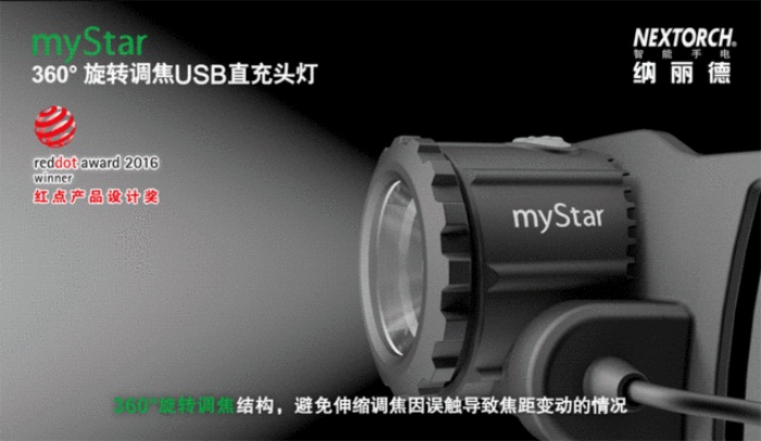 纳丽德myStar旋转调焦USB直充头灯,采用专利菲涅尔透镜调焦技术,实现360度旋转调焦,可以根据不同环境场合的需求,调节聚光、散光用以照明。