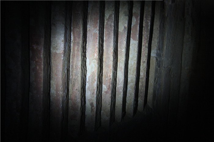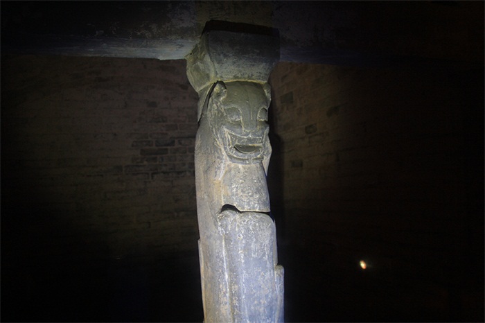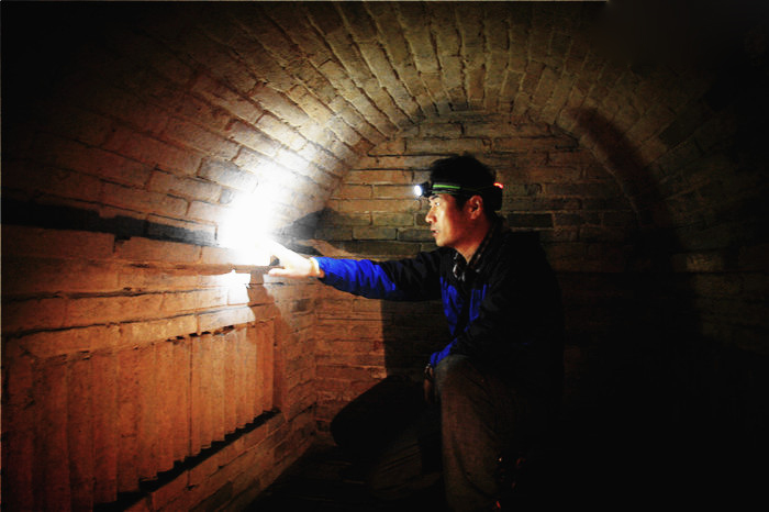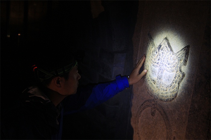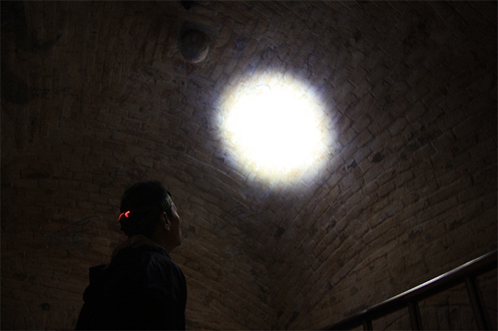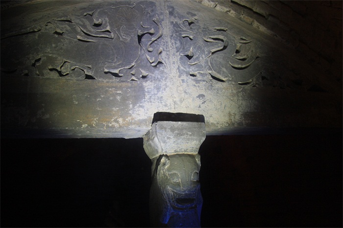 另一个墓室内的夫妻对饮图,人物采用阳刻,有趣的是桌子直接砌出,桌上有阴刻的酒杯,酒壶反而呈现阳刻,并有板凳的轮廓,好似夫妻二人桌旁坐定,对饮聊天。老妇人还揣着手,趣味十足。在不断的调整头灯的对焦与泛光,感觉200流明的对于5米之内的景物颜色的还原性非常好。