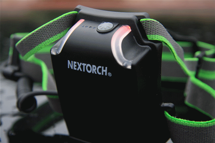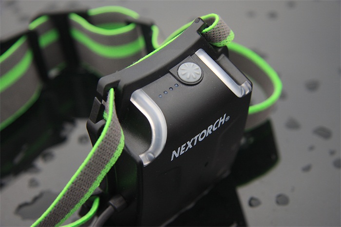 在电池顶部设置的电源主开关,按钮表面八根筋的设计秉承纳丽德手电的一贯传统,按键内微动开关经人体工程学的设计,向下的按动压力轻重经过特殊设计,介于10-30N/CM2之间。按钮左侧有4个电量视窗显示,用于查看剩余电量和电量是否充满的指示,用蓝色微光显示。在电源按键按下后首先显示剩余电量。