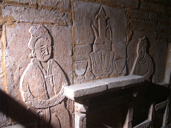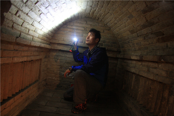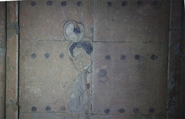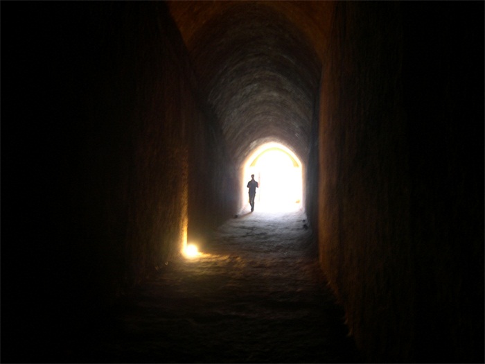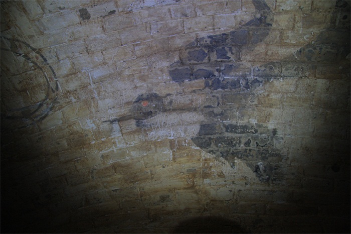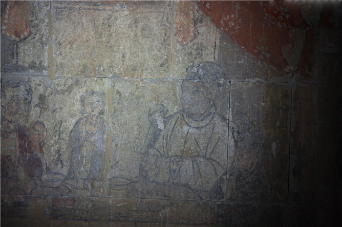 这是其中一个侧室,一个人直不起腰,拱形的内壁上有些小型的壁画,注意下我腿前的竖砖砌法,与别的墓室不同。