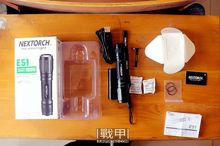 具体拆分后包括E51手电主体,手绳,2600毫安18650电池、mircoUSB充电线、O型防水圈、抱夹以及说明书等