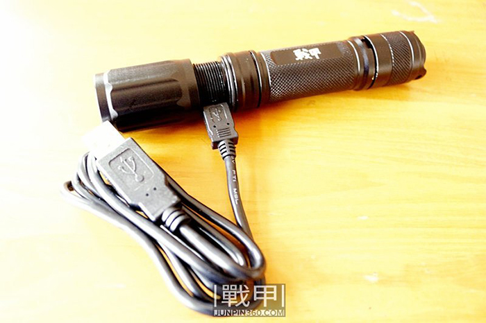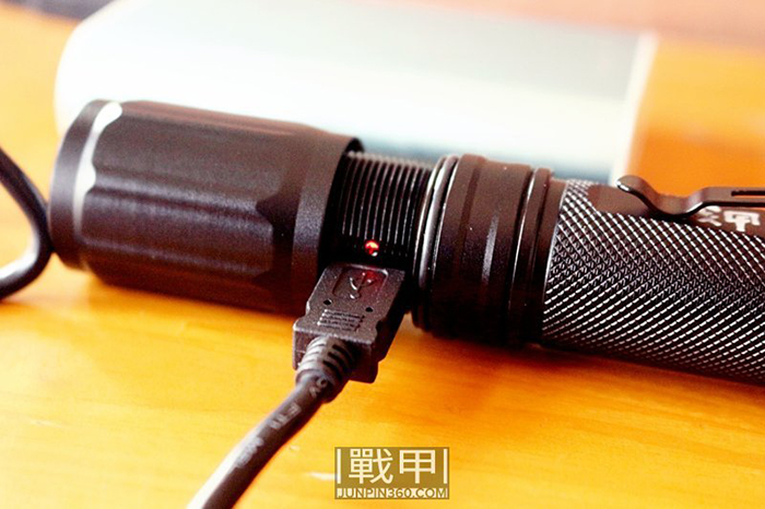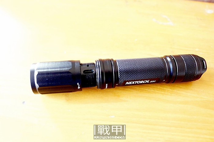 接这看下E51的充电口,与TA5一样都是隐藏式的,在筒头的正前方就会发现USB充电的标志,充电前需要拧开前端的筒头,就可以解锁隐藏式的USB充电口。E51与TA5一样在螺纹末端有防水圈,螺纹和胶圈的配合很容易达到高度可靠的防水(开水也行)防水的设计可以便于雨天使用,无论是执勤还是户外使用都会碰上雨天。