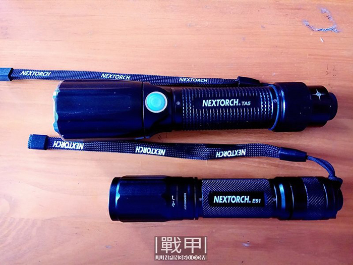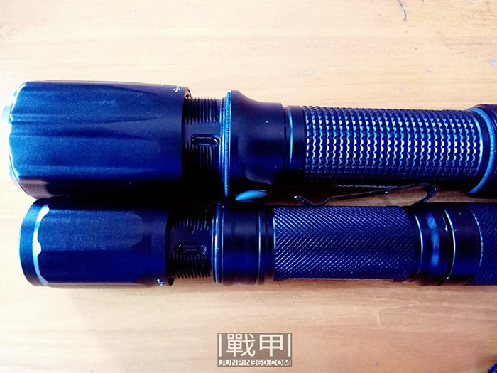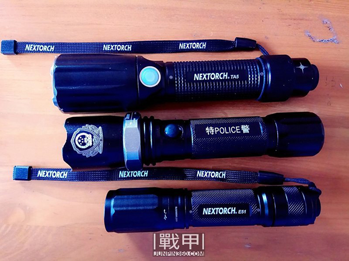 与另外两款手电对比下,从上至下分别是TA5 公发手电 E51,在长度上是TA5>公发手电>E51,这是正面效果,正面都有各自的官方Logo